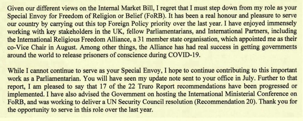 Rehman Chishti MP announced today “I’ve written to the PM resigning as PM’s Special Envoy on FoRB. I can’t support Internal Market Bill in its current form, which unilaterally break UK’s legal commitments. As an MP for 10 yrs & former Barrister, values of respecting rule of law & honouring one’s word are dear to me.”